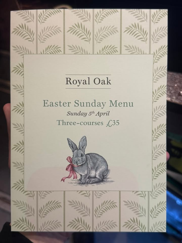 🐣 Easter Sunday at The Royal Oak 🐣 Join us on Sunday 5th April for our Easter Sunday set menu — three courses for £35. We’ve got a proper line-up of starters, classic Sunday roasts (including British beef, chicken, pork, and lamb rump), and some great puddings to finish things off. Perfect for settling in for a relaxed Easter Sunday with good food and a glass of something nice. 🍽️🍷 You might spot a small typo on the menu… yes, it currently says “lamp rump.” We can confirm there will be no lamps on the plate, only lamb. Honest mistake, but we’re quite enjoying it. 💡🐑 Bookings recommended for Easter Sunday. Give us a call or pop in to reserve a table.